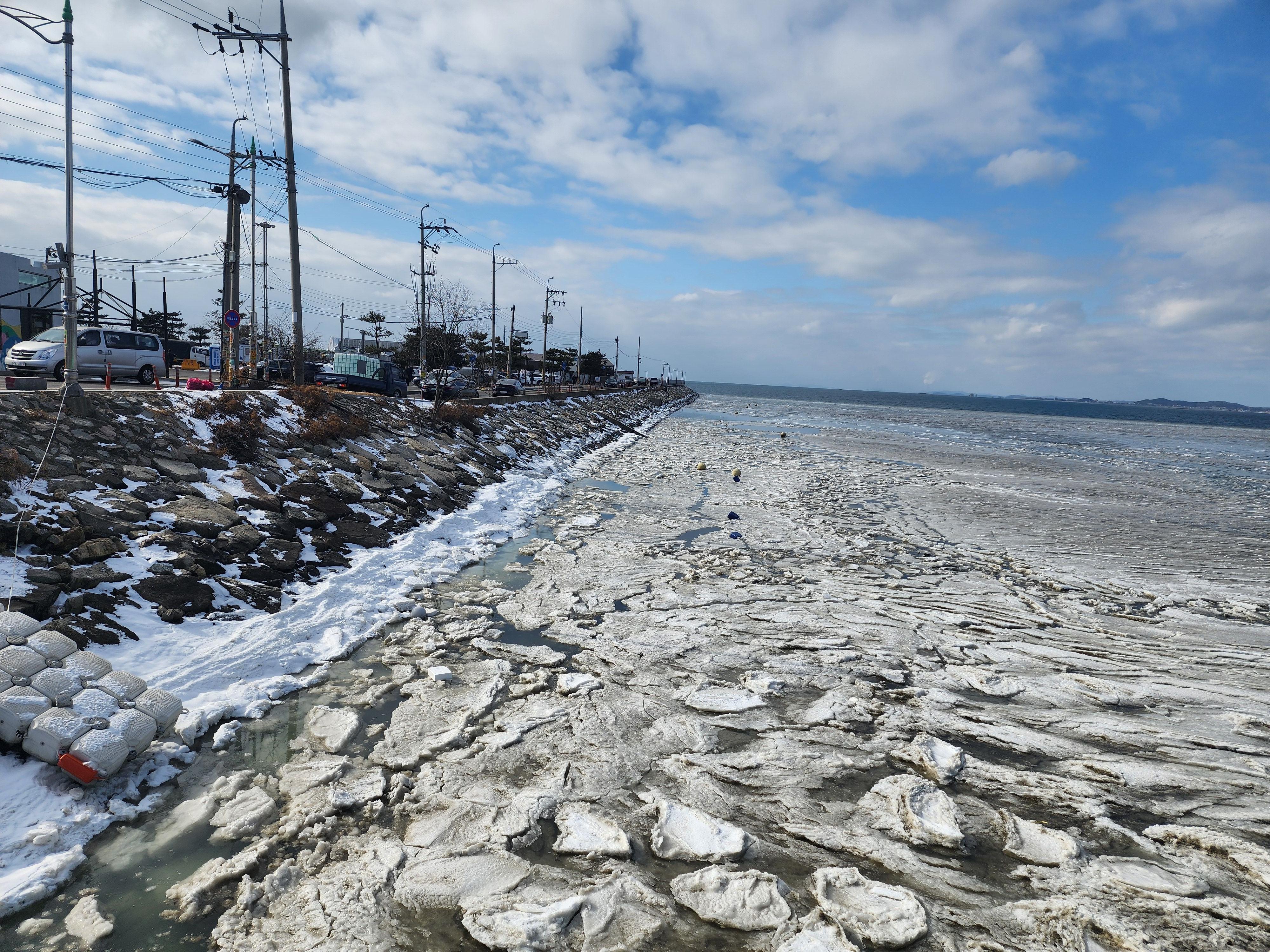 저번주에 온눈이 아직 안녹아 바다위에 얼어 버린거 같습니다.